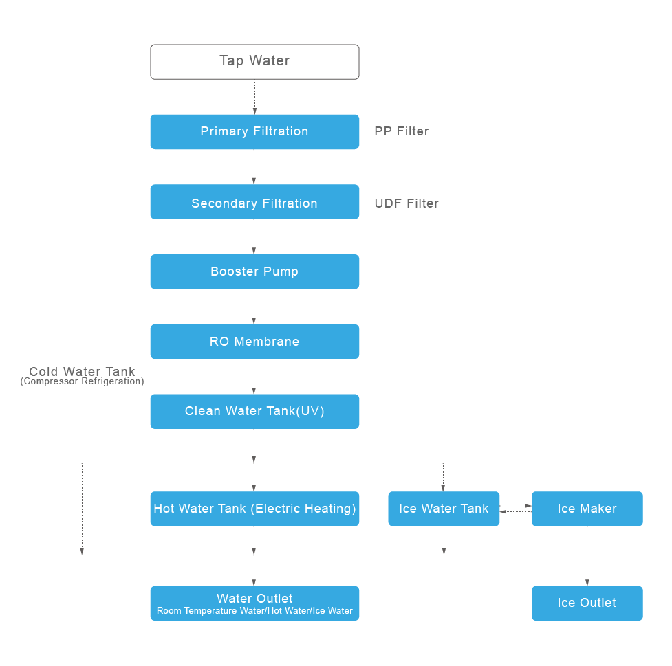 Questo erogatore d'acqua verticale utilizza un sistema di filtrazione a due stadi, ognuno dei quali fornisce un livello di purificazione distinto. È inoltre dotato di un modulo a membrana a osmosi inversa (RO), che filtra l'acqua attraverso più strati, trasformandola in acqua sicura e pronta da bere. L'unità offre acqua calda, fredda o a temperatura ambiente personalizzabile su richiesta. Inoltre, offre una doppia opzione per la produzione di ghiaccio o acqua frizzante, offrendo una scelta versatile.