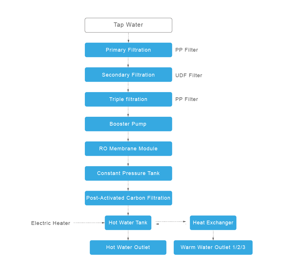 Questo erogatore d'acqua da banco utilizza un sistema di filtrazione a tre stadi, ognuno dei quali progettato per un diverso livello di purificazione. Grazie al modulo a membrana RO, filtra progressivamente le impurità attraverso più strati, erogando acqua potabile pulita e sicura, pronta per il consumo. L'unità offre acqua calda, fredda o a temperatura ambiente personalizzabile su richiesta. È inoltre dotato di più rubinetti, garantendo un flusso d'acqua ad alta capacità per soddisfare in modo efficiente le esigenze di diversi scenari di utilizzo.